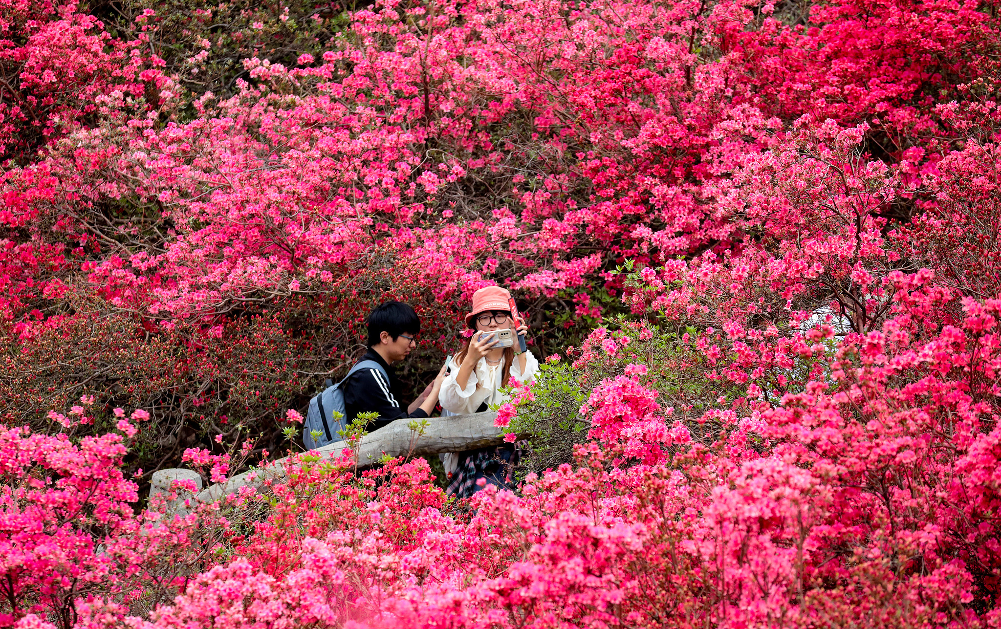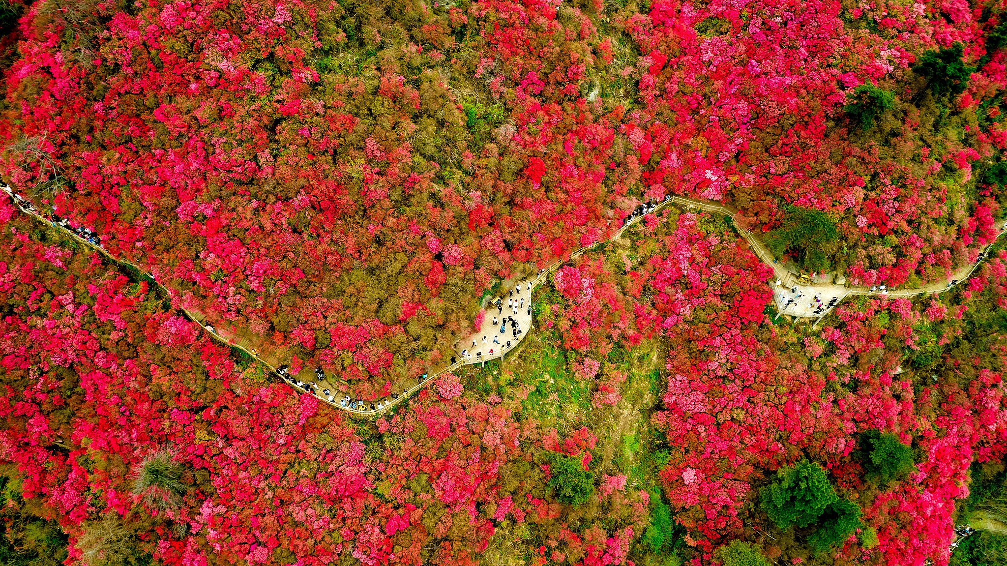 In recent days, a magnificent sea of rhododendrons nestled on Mulan Yunwu Mountain in central China's Wuhan has joyously entered its highly anticipated full bloom period. As far as the eye can see, a palette of vibrant colors and delicate petals stretch out, painting a picture of natural beauty that is truly second to none.