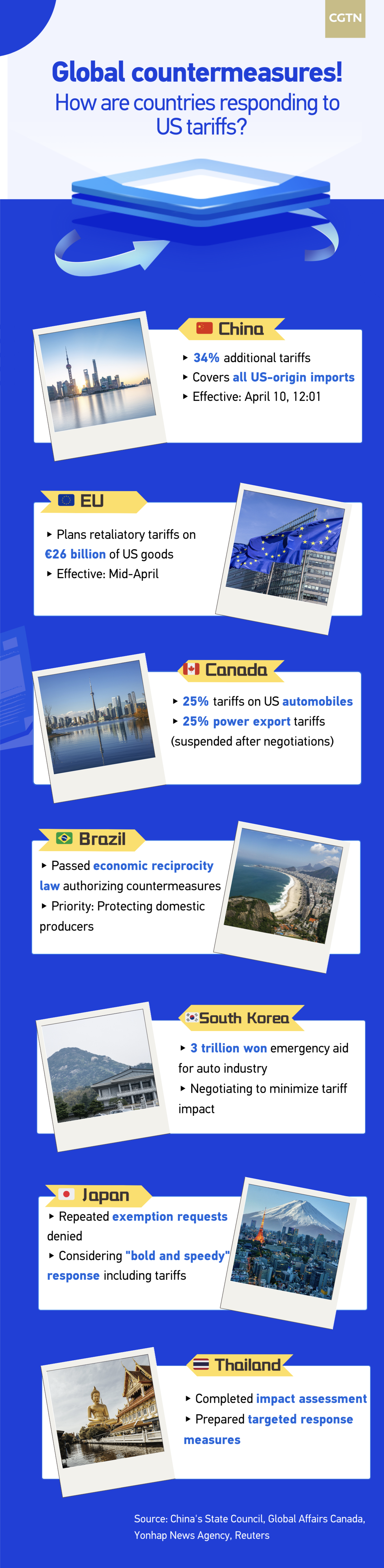 Multiple countries are hitting back at US tariff hikes. China will impose an additional 34 percent tariff on all US-origin imports starting April 10, while the EU, Japan, Thailand and others are preparing responses. Who will make the next move?
