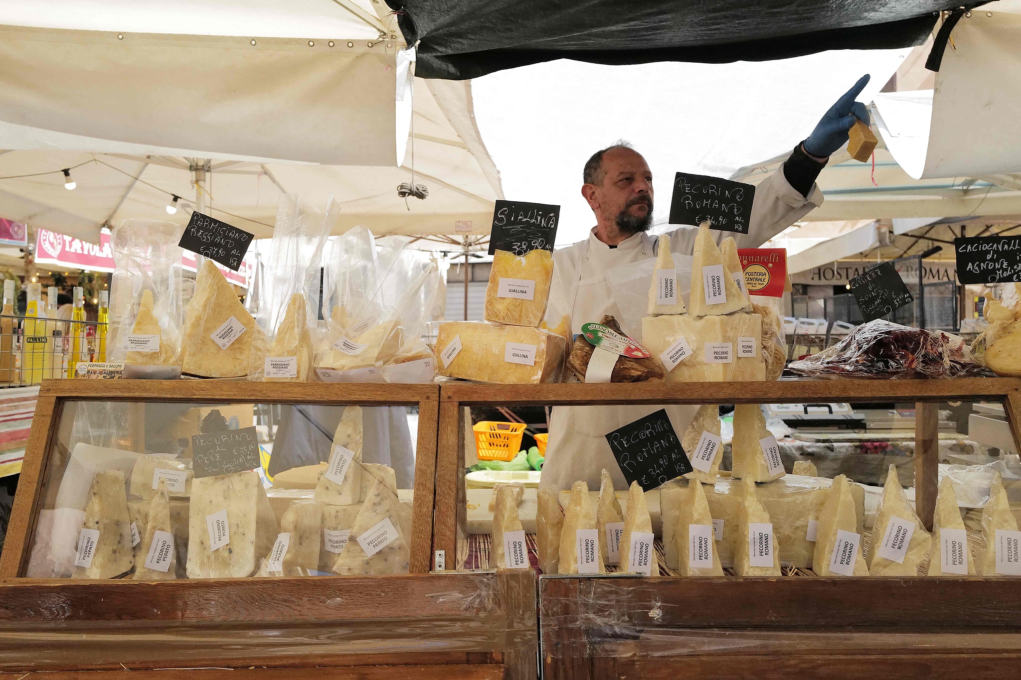 Cheese on sale at a stall of the market at Piazza Campo dei Fiori in Rome, Italy, April 4, 2025. /VCG