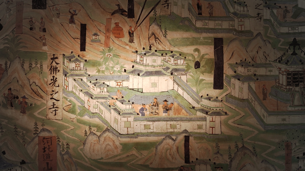 A depiction of a mural showing Mount Wutai and Foguang Temple. /CGTN