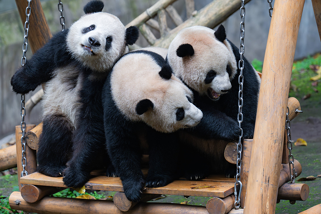 Three pandas face off in a playful standoff over swing time at Chongqing Zoo, April 6, 2025. /VCG