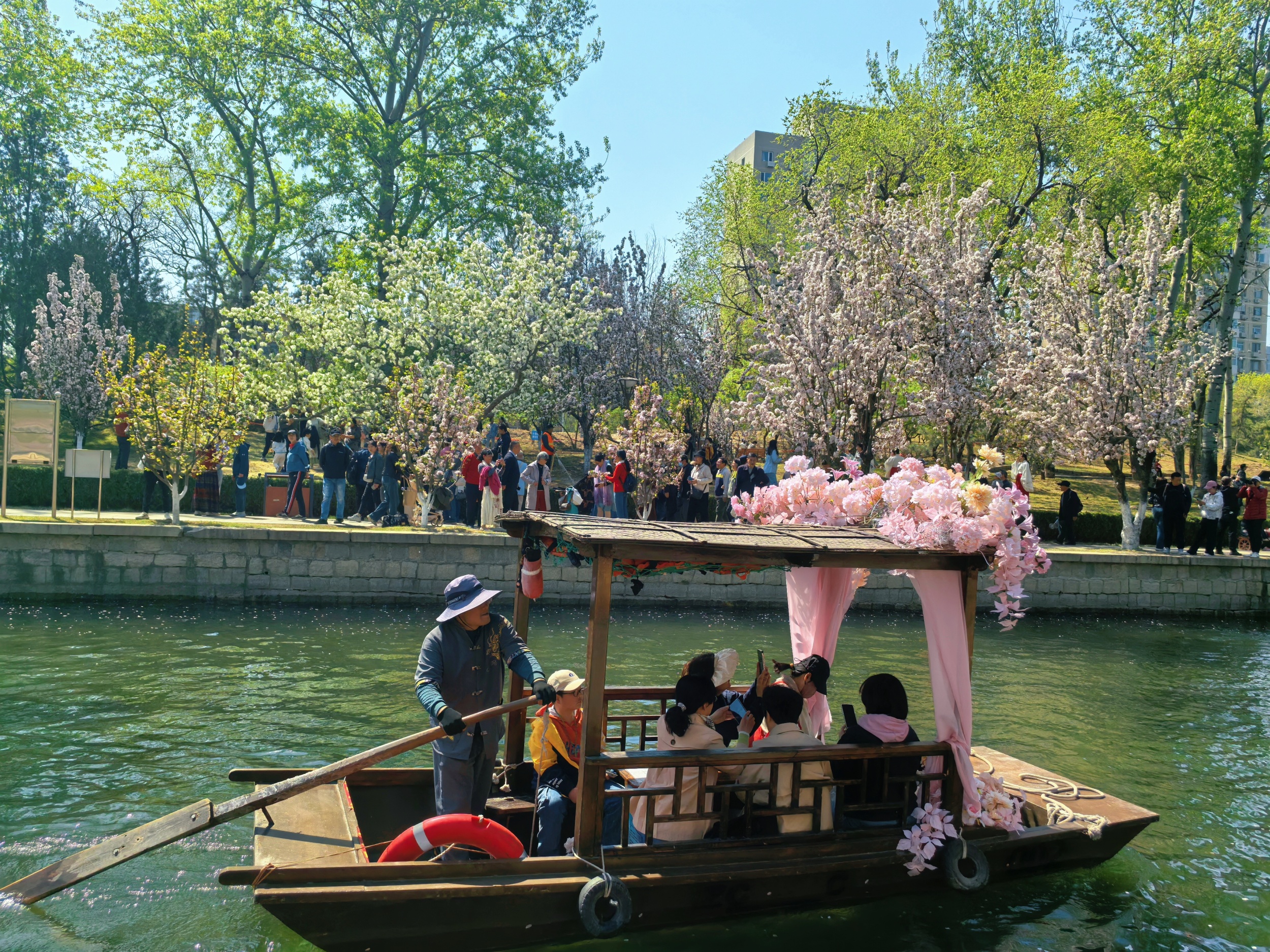 Tourists take a ride on an ancient-style sculling boat to enjoy views of crabapple flowers at the Yuan Dynasty Dadu City Wall Relics Park in Beijing on April 6, 2025. /CGTN