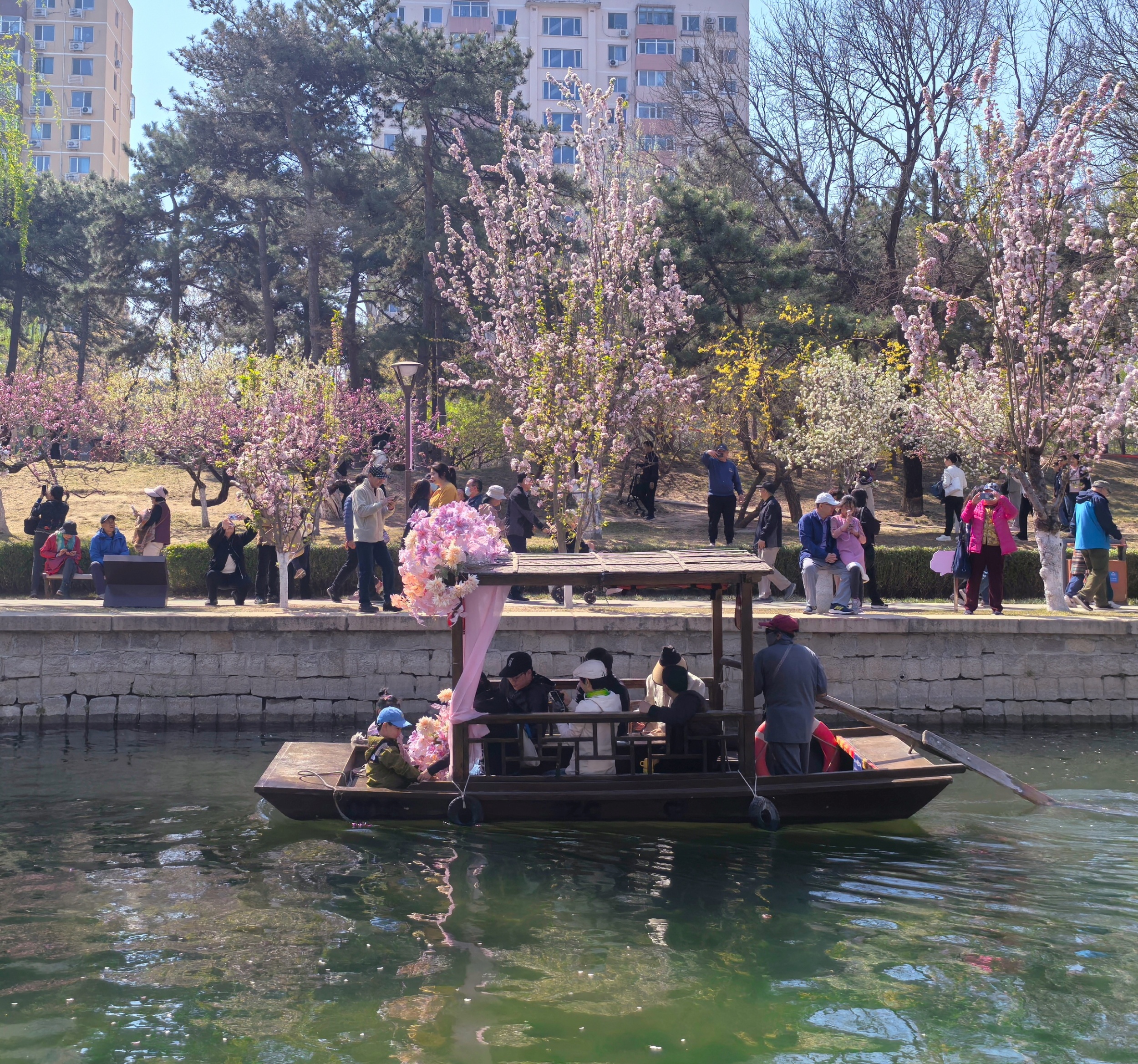 Tourists take a ride on ancient-style sculling boats to enjoy views of crabapple flowers at the Yuan Dynasty Dadu City Wall Relics Park in Beijing on April 6, 2025. /CGTN