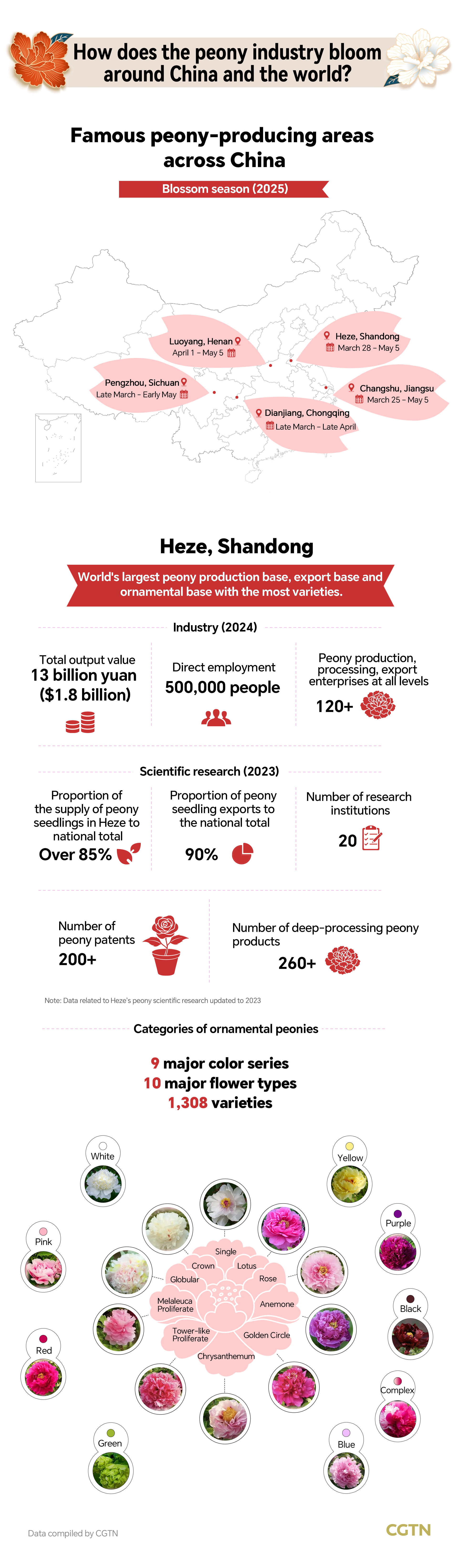 Each year, millions of seedlings and over 260 types of peony-derived products – ranging from seed oil and tea to skincare items – are exported to dozens of countries and regions worldwide. According to the Peony Industry Development Center of Heze, the total output value of the peony industry in Heze reached 13 billion yuan ($1.8 billion), creating more than 500,000 jobs in 2024.
