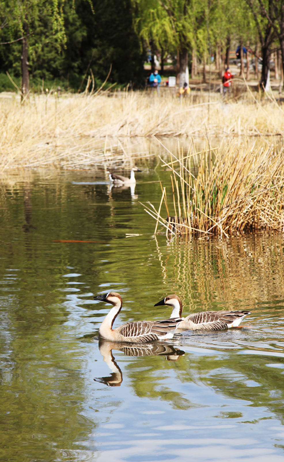 Waterfowl swim in a pond at the Olympic Forest Park in Beijing on April 5, 2025. /CGTN