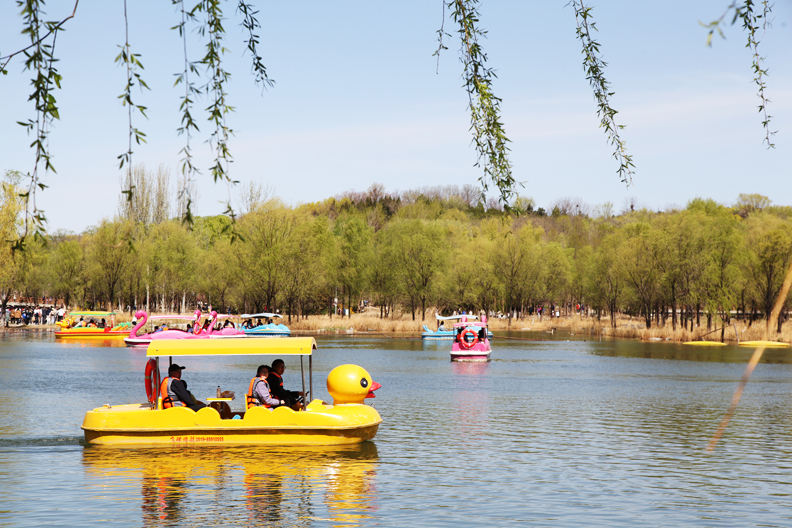 Visitors ride boats across a lake at the Olympic Forest Park in Beijing on April 5, 2025. /CGTN
