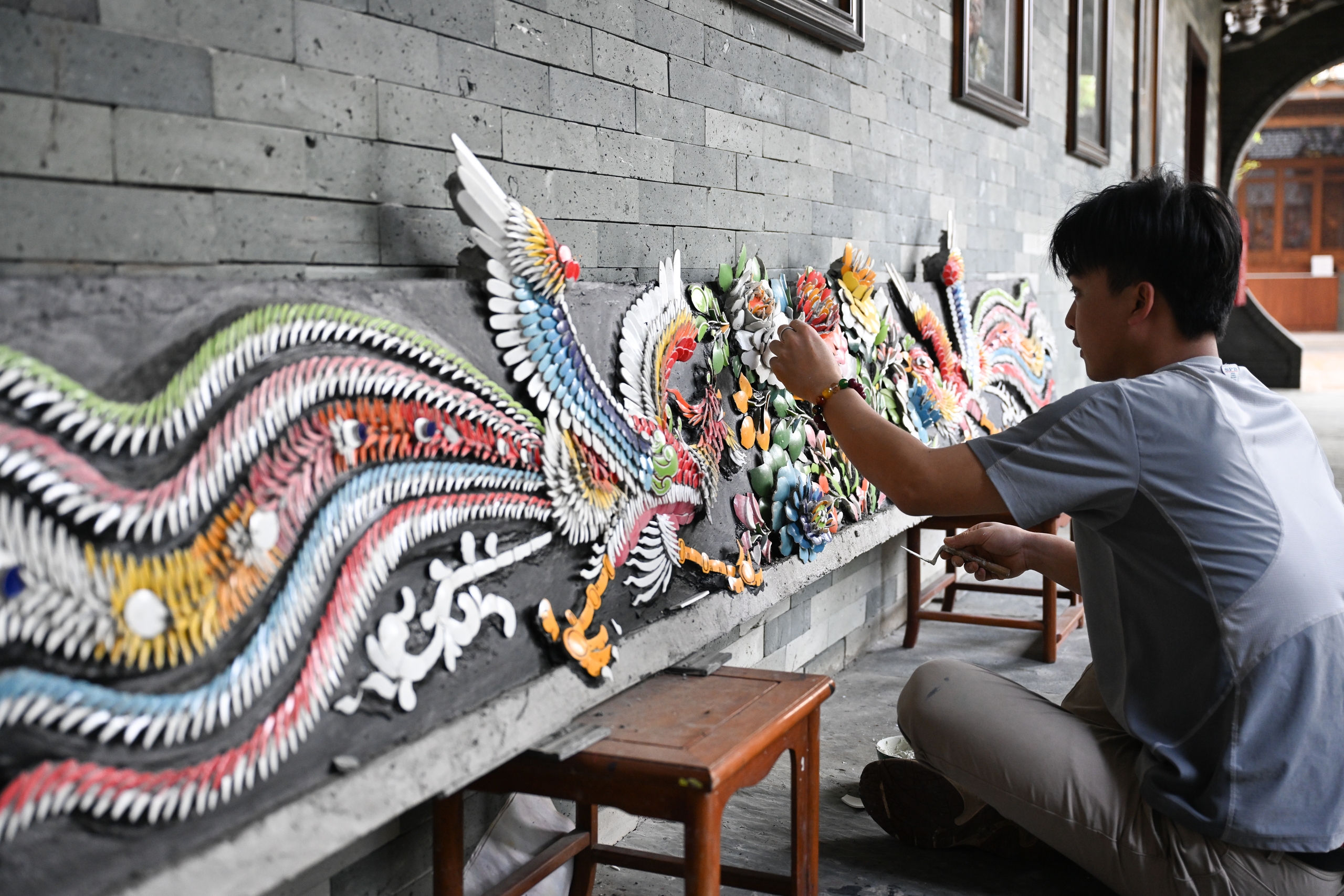 Porcelain inlay artisan Xu Mingtai colors a phoenix sculpture in Chaozhou, Guangdong Province on April 7, 2025. /IC