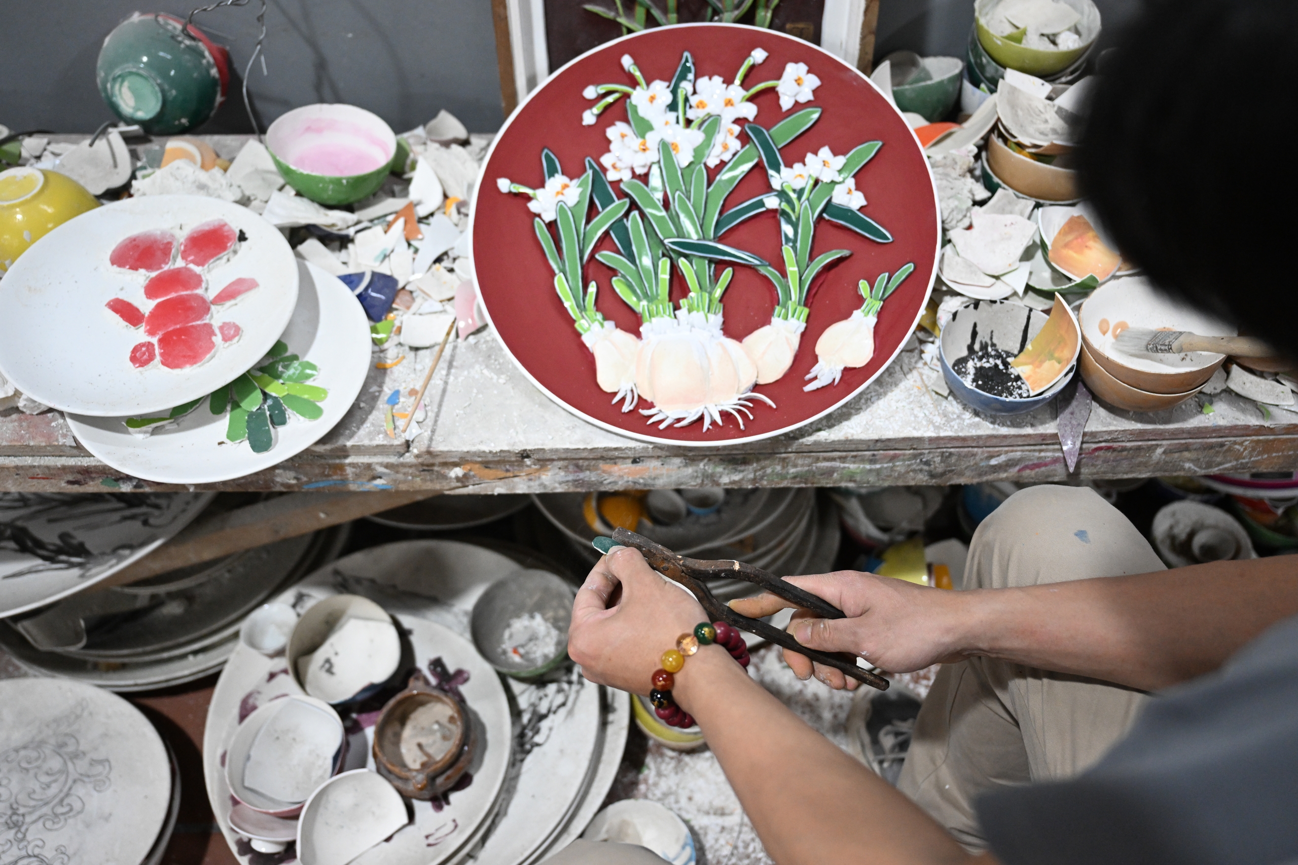 Porcelain inlay artisan Xu Mingtai cuts porcelain into various sizes in Chaozhou, Guangdong Province on April 7, 2025. /IC