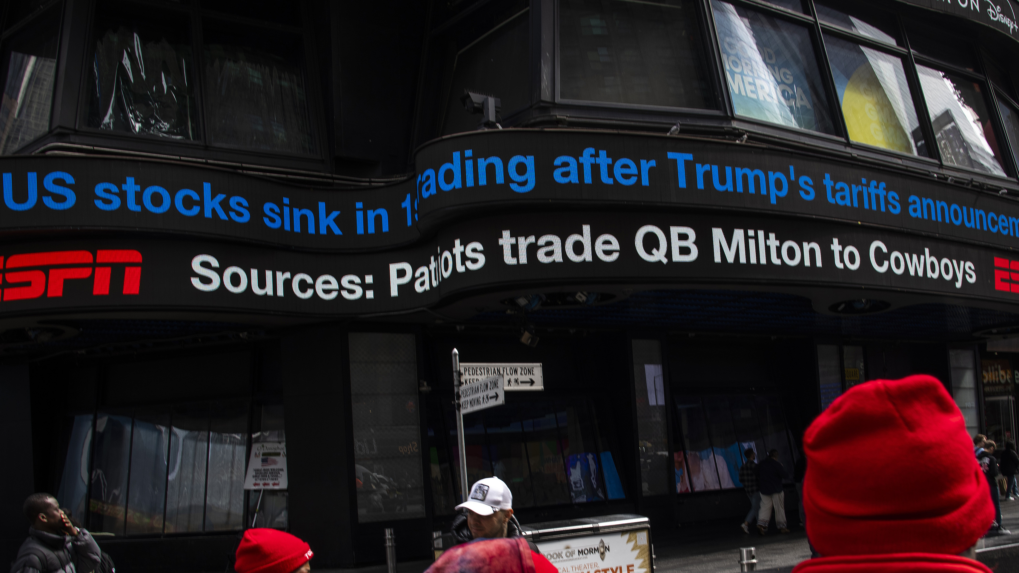 Electronic billboards in Times Square show news about Trump's tariffs, New York City, April 3, 2025. /VCG