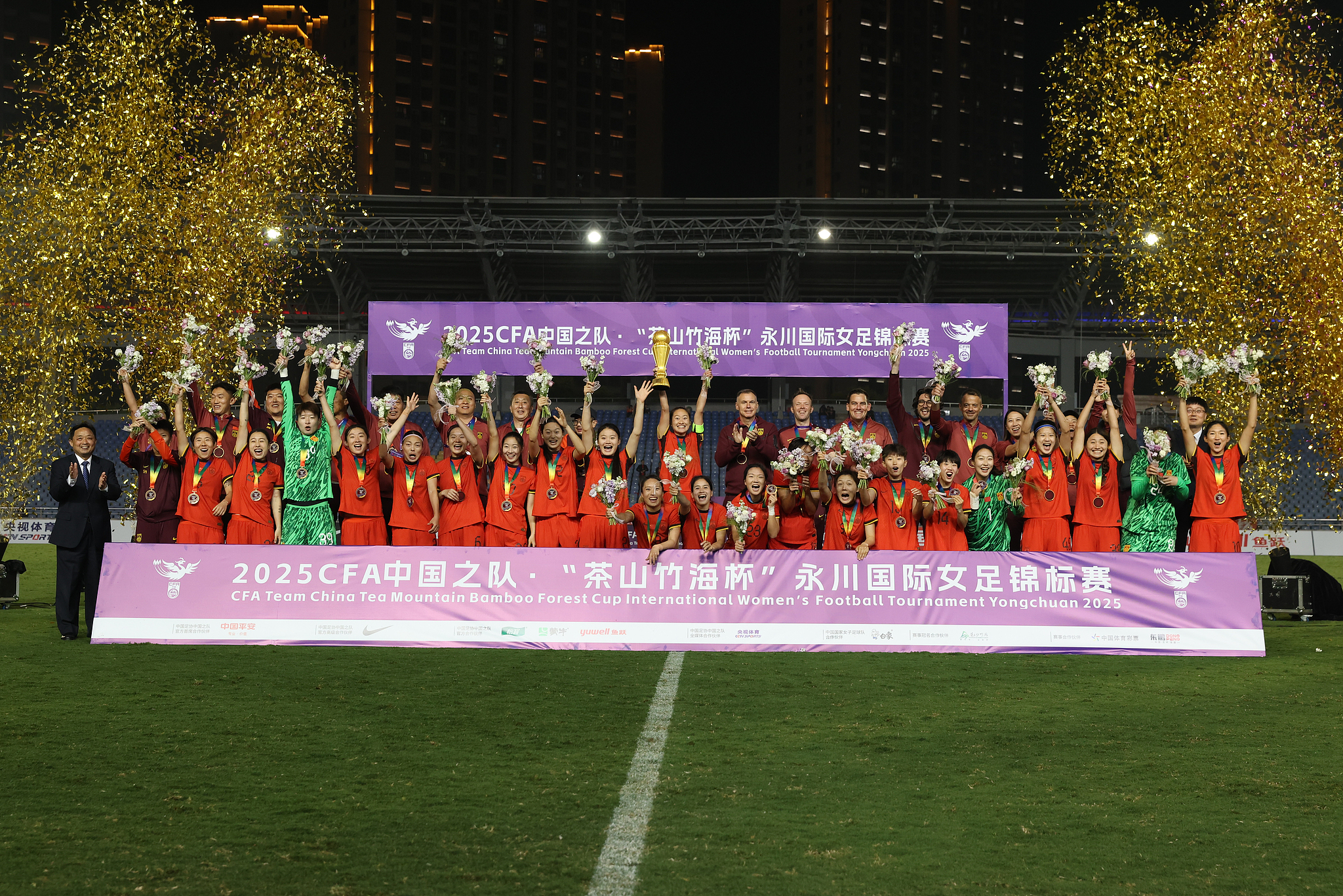 China's football team celebrate winning the Yongchuan International Women's Football Tournament in southwest China's Chongqing Municipality, April 8, 2025. /VCG