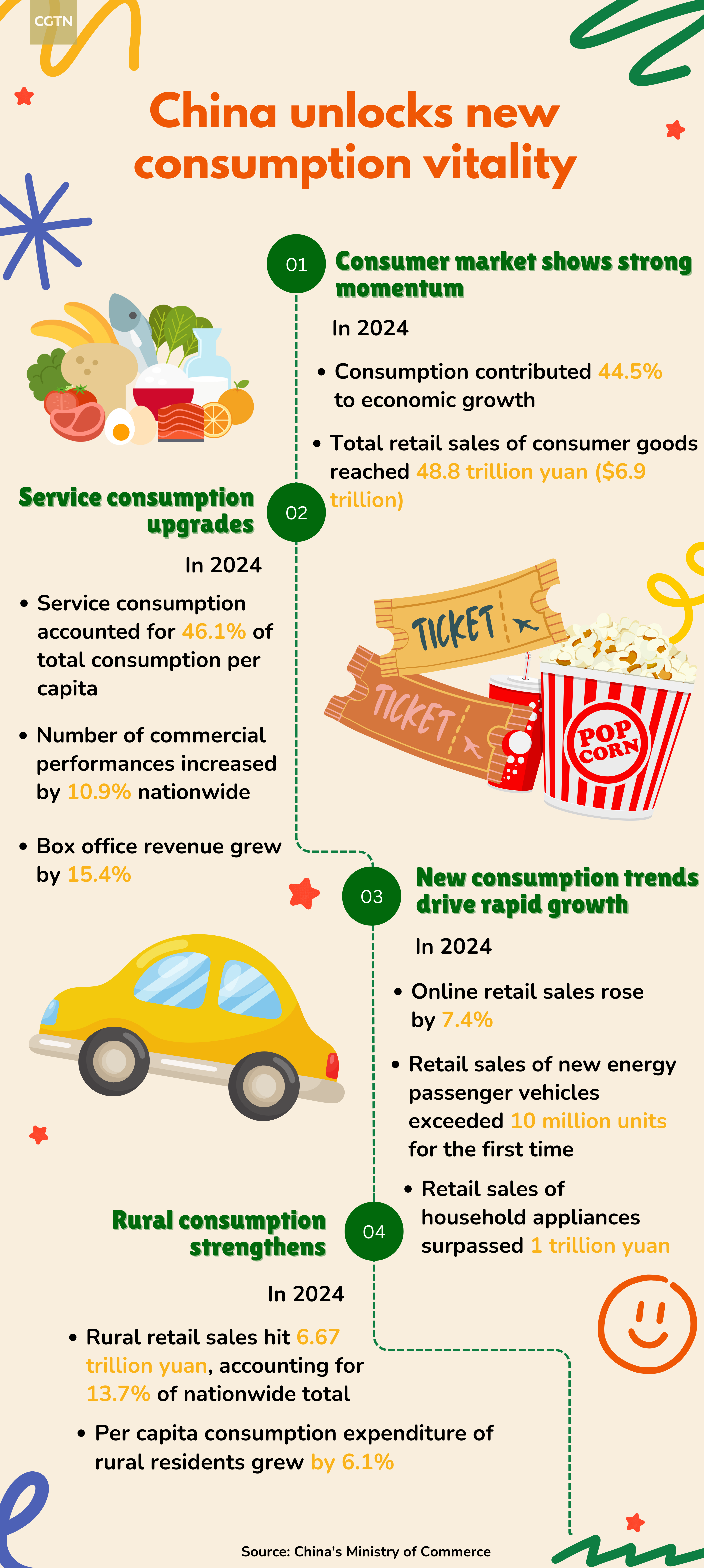 Bolstered by supportive policies, China's consumer market continues to demonstrate robust growth, according to official data. This momentum is reflected in many aspects of the economy such as rising consumer demand, the ongoing upgrade of service consumption and the accelerated expansion of rural spending. Check out this poster for more!