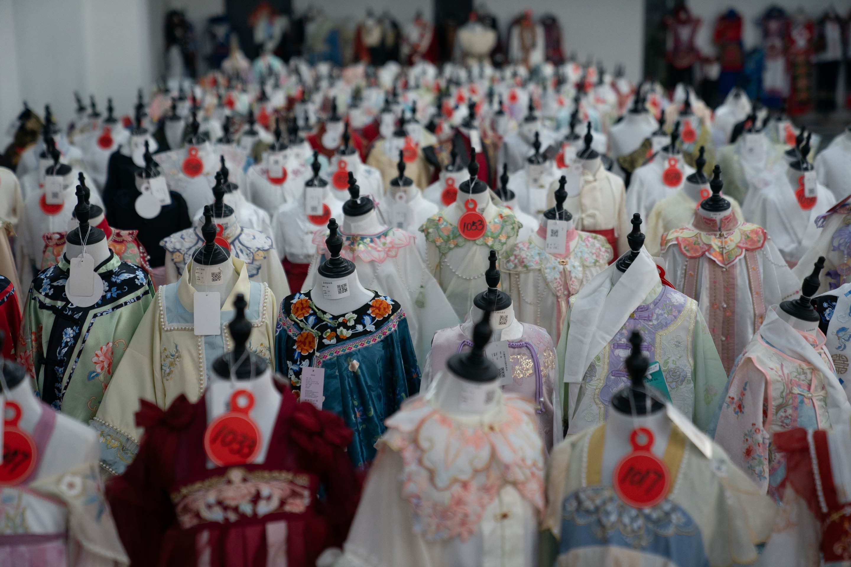 The production model has also modernized without losing its roots. Where factories once operated behind storefronts ("front shop, back factory"), they now sit behind live-streaming studios. Massive Hanfu display halls stand beside rows of soundproof streaming booths where hosts showcase their latest designs.