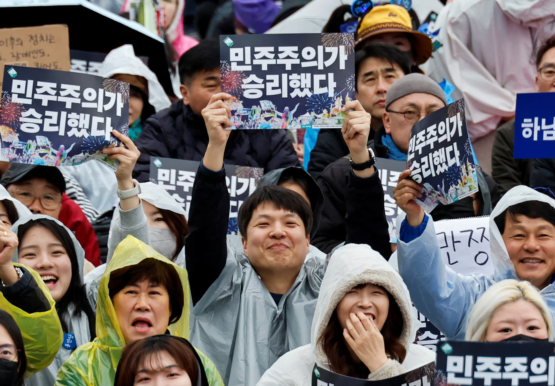 People holding placards that read "Democracy Won" attend a rally to celebrate the expulsion of South Korean President Yoon Suk-yeol in Seoul, South Korea, April 5, 2025. /Reuters