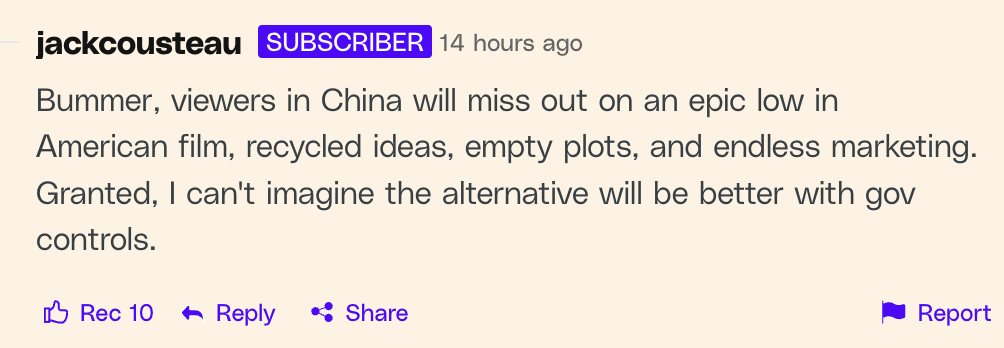 The decision also sparked online discussions among international audiences. A commenter named jackcousteau on American technology news website The Verge remarked, "Bummer, viewers in China will miss out on an epic low in American film, recycled ideas, empty plots, and endless marketing."