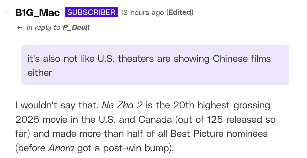 Responding to a claim that U.S. theaters rarely show Chinese films, a user named B1G_Mac pointed out: "I wouldn't say that. Ne Zha 2 is the 20th highest-grossing 2025 movie in the U.S. and Canada (out of 125 released so far) and made more than half of all Best Picture nominees."