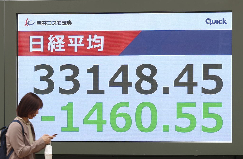 A display shows the sharp decline in the Nikkei average stock price due to US President Donald Trump administration's tariff policies in Chuo Ward, Tokyo, April 11, 2025. /VCG