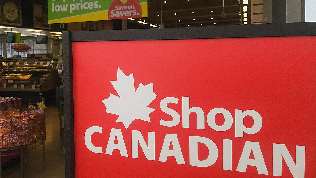 Close-up of 'Shop Canadian' poster displayed in a local storefront in Edmonton, Alberta, Canada, April 4, 2025. /VCG