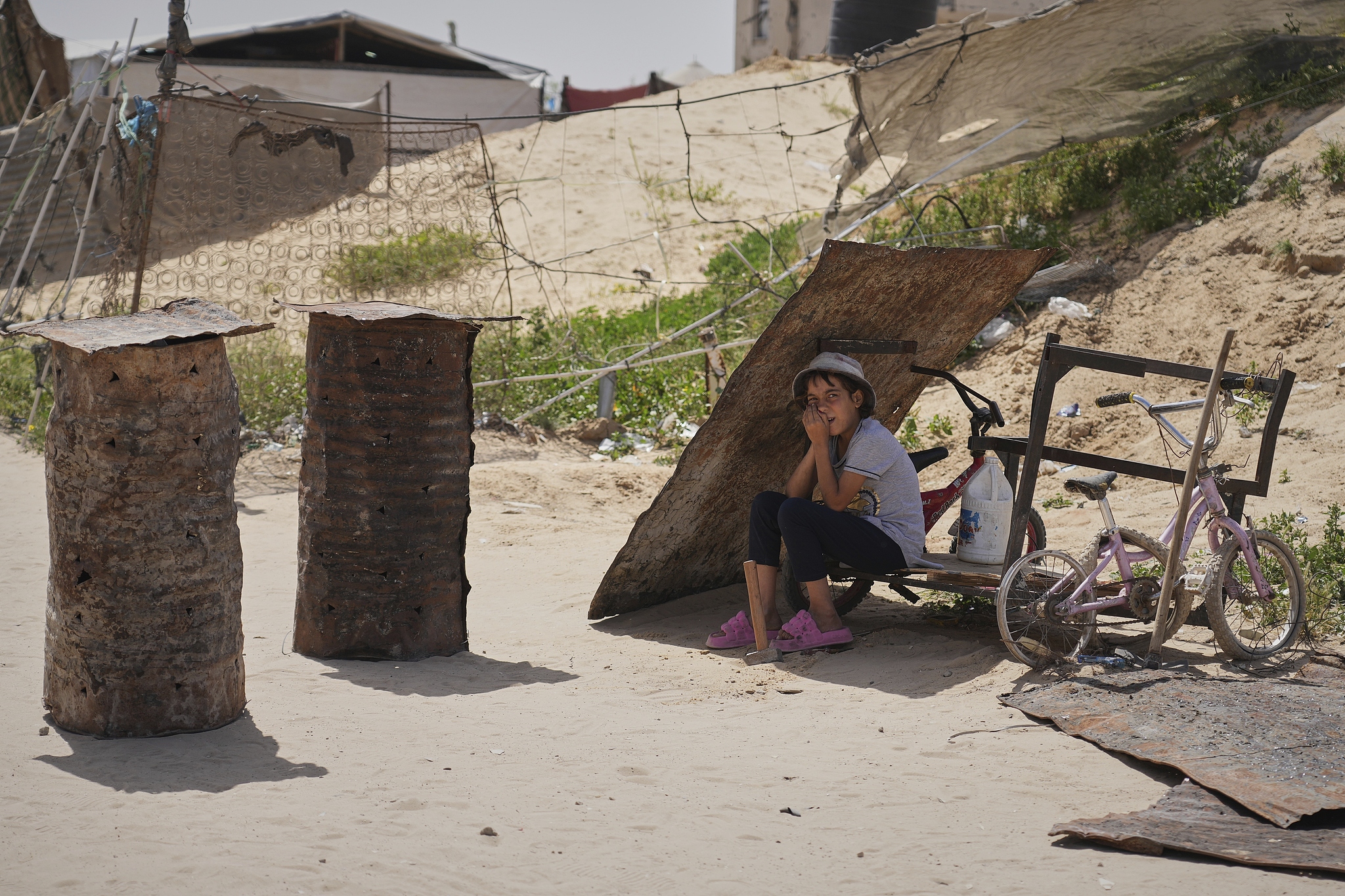 Displaced 12-year-old kid takes cover from the sun after arriving from Rafah following an evacuation warning from the Israeli military, in Khan Younis, southern Gaza Strip, April 3, 2025. /VCG