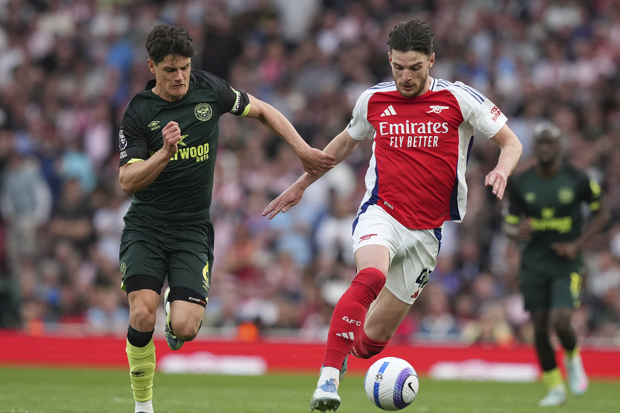 Arsenal's Declan Rice (R) and Brentford's Christian Norgaard battle for the ball during an Premier League match at the Emirates Stadium in London, England, April 12, 2025. /VCG