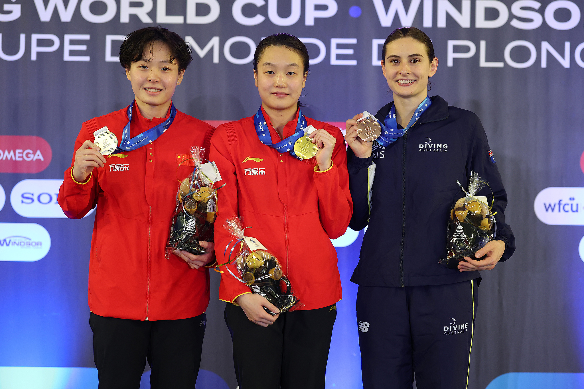 L-R: Women's 3-meter springboard silver medalist Chen Yiwen and gold medalist Chen Jia of China, and bronze medalist Maddison Keeney of Australia pose for a photo after the awards ceremony at the World Aquatics Diving World Cup in Windsor, Canada, April 13, 2025. /VCG