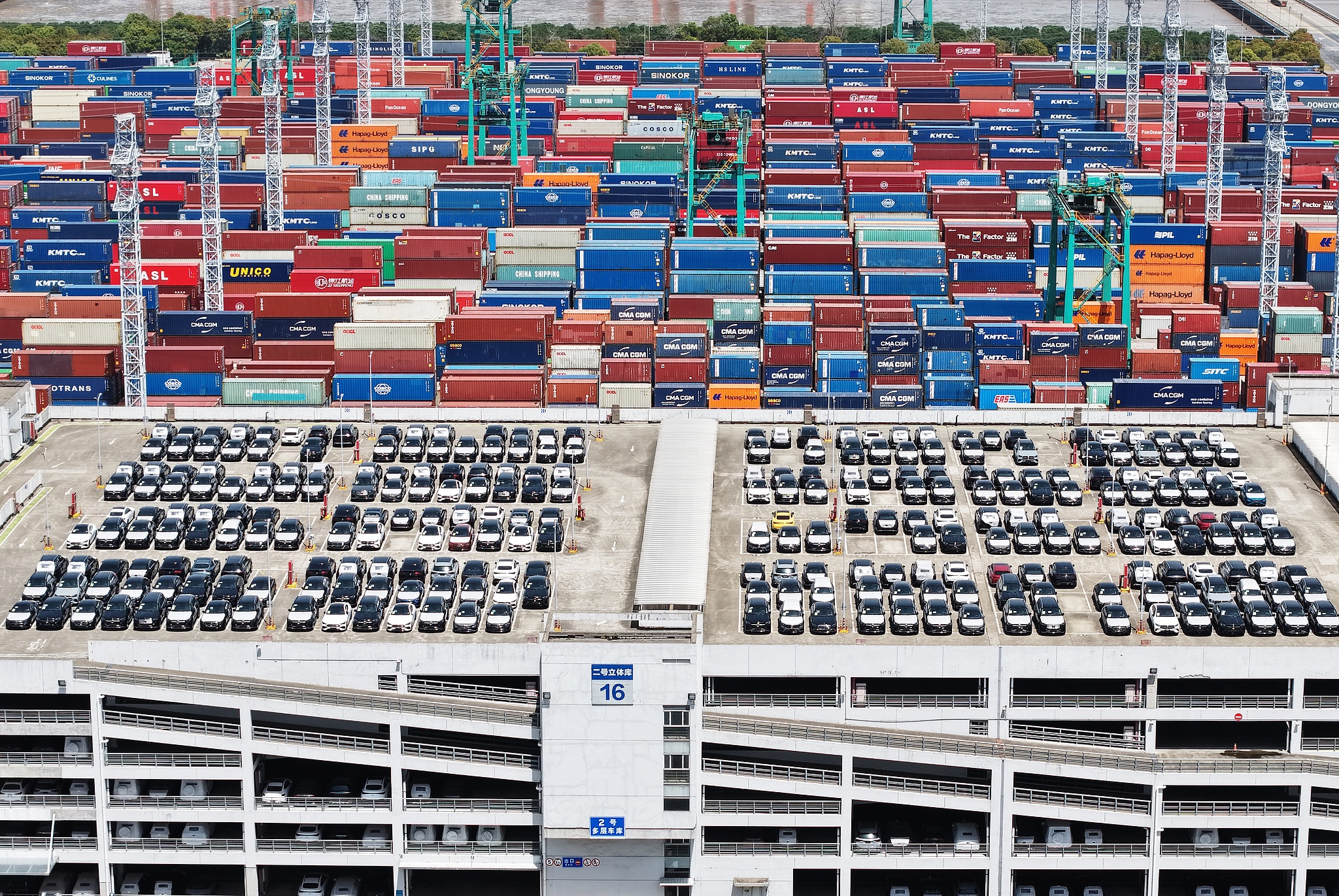 Stacks of containers and new energy vehicles awaiting export at a container terminal in Shanghai Port, China, April 13, 2025. /VCG