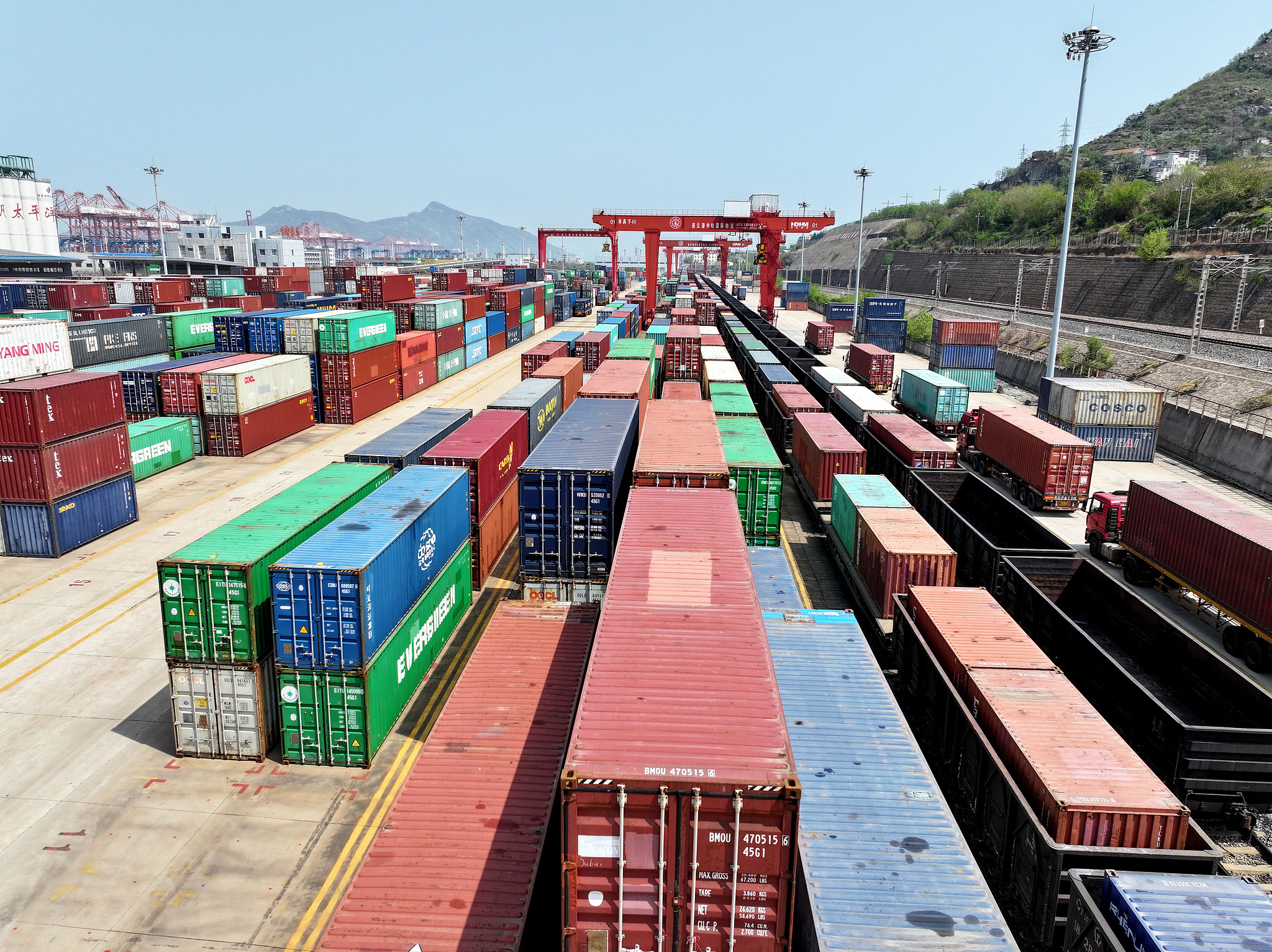 Containers being loaded onto the China-Europe Railway Express at a port in Lianyungang, Jiangsu Province, China, April 10, 2025. / VCG