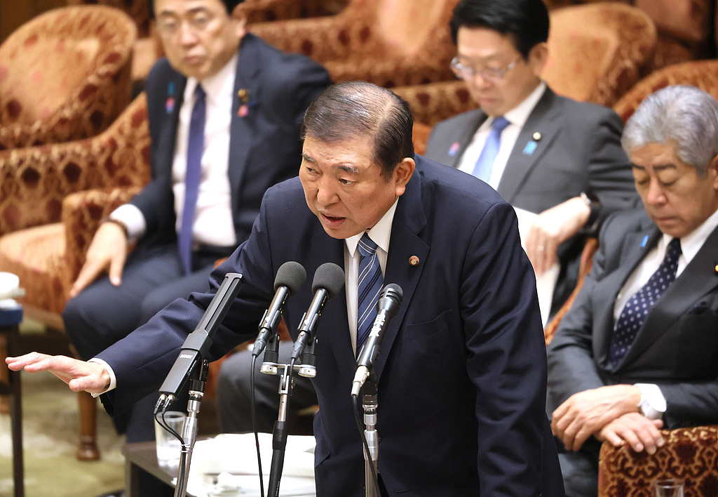 Japanese Prime Minister Shigeru Ishiba answers a question at the Lower House Budget Committee session, Tokyo, Japan, April 14, 2025. /VCG