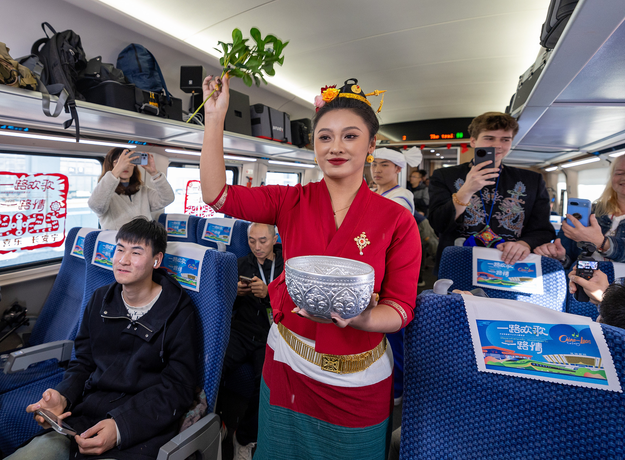 The D87 China-Laos international passenger train departs from Kunming South Railway Station in Yunnan Province, heading south toward Vientiane, Laos, January 14, 2025. / CFP