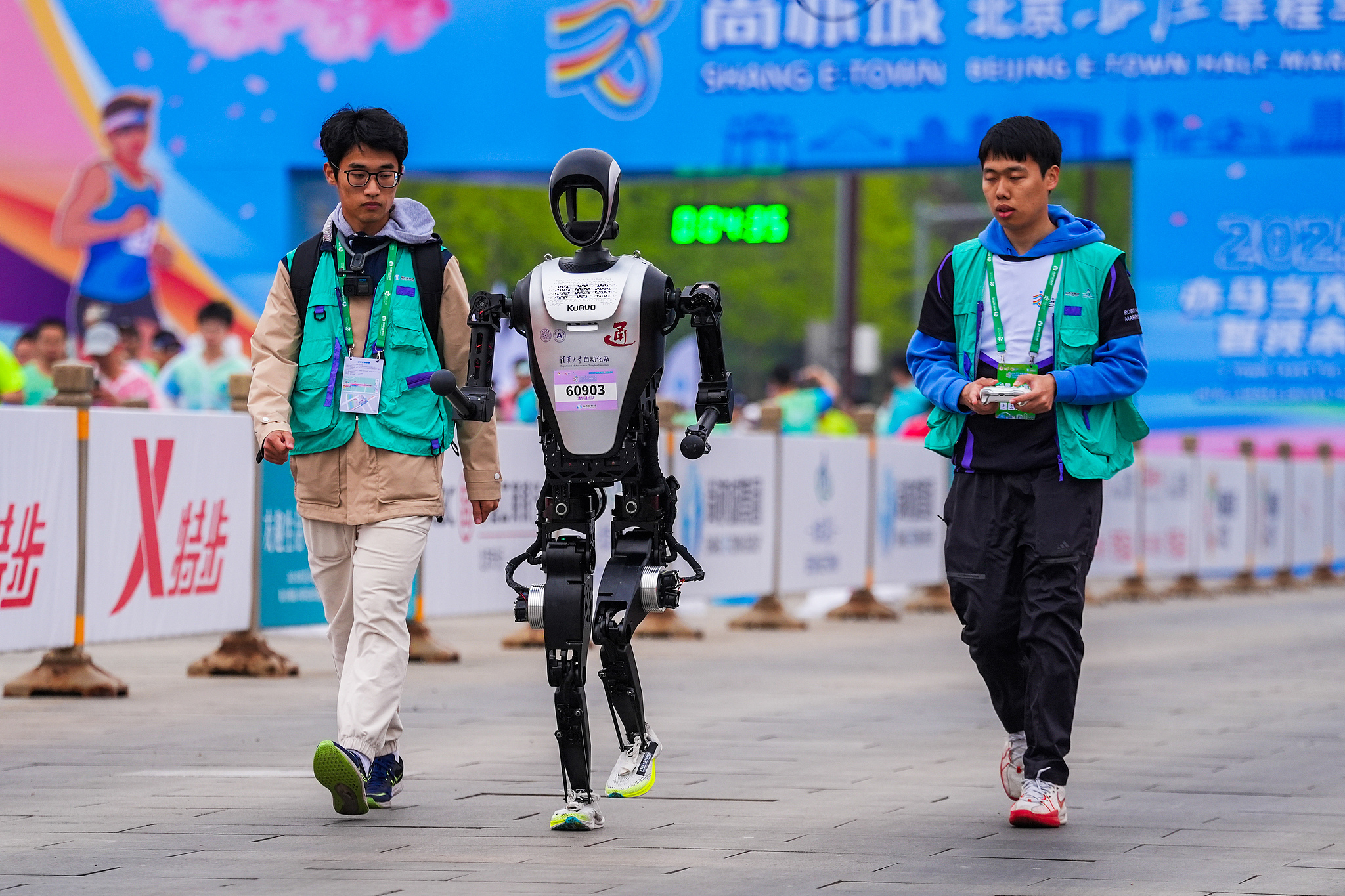 A robot prepares to attend the world's first humanoid robot half-marathon in Beijing on April 19, 2025. /IC
