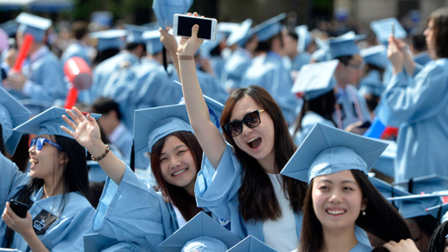 Graduate students from China pose for photos on campus after the Columbia University Commencement ceremony in New York, the United States, May 22, 2019. /Xinhua