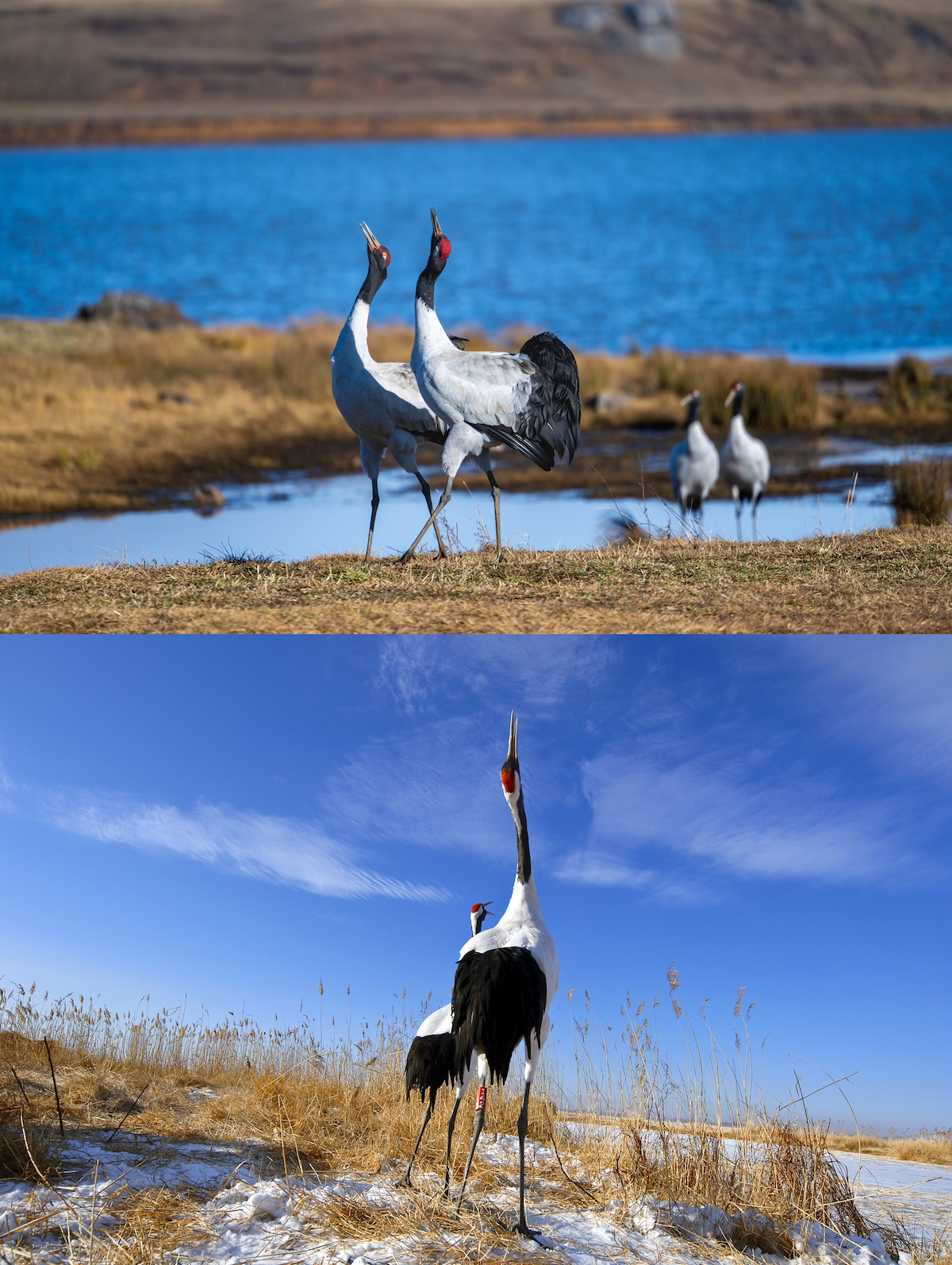 Black-necked cranes (top) and red-crowned cranes. /VCG