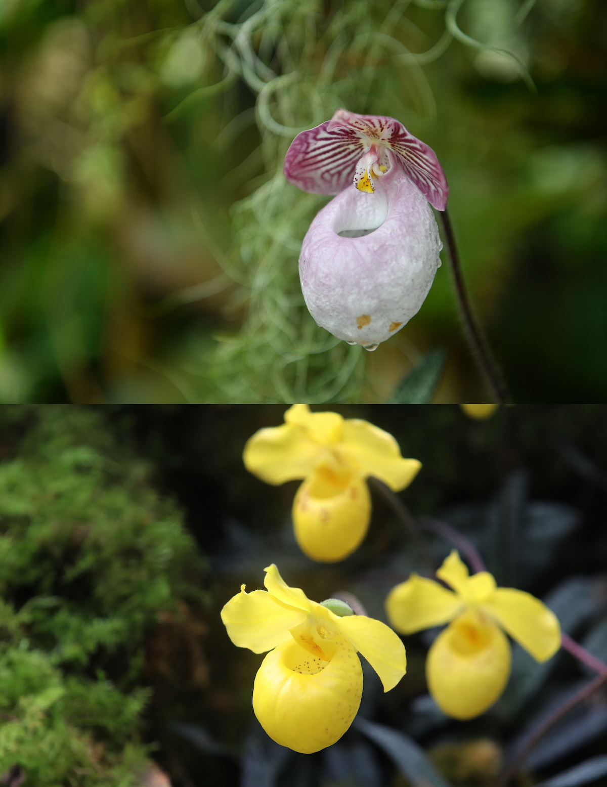 A hard-leaved pocket orchid (top) and golden slipper orchids. /VCG