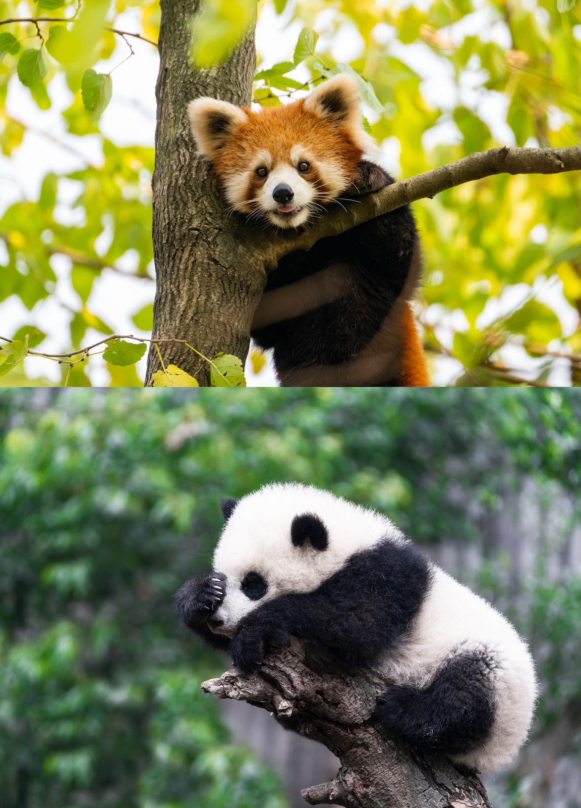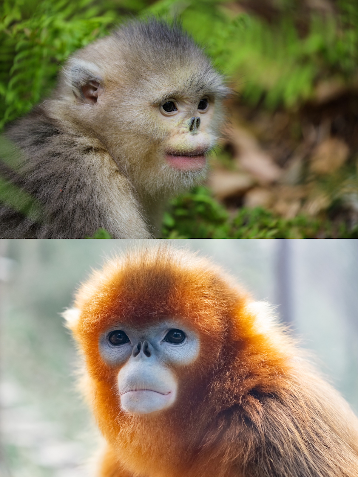 An endangered Yunnan snub-nosed monkey (top) and an endangered golden snub-nosed monkey. /VCG