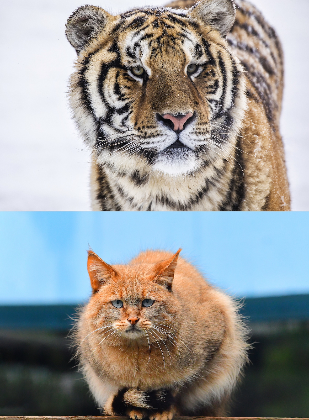 A Siberian tiger (top) and a Chinese mountain cat. /VCG