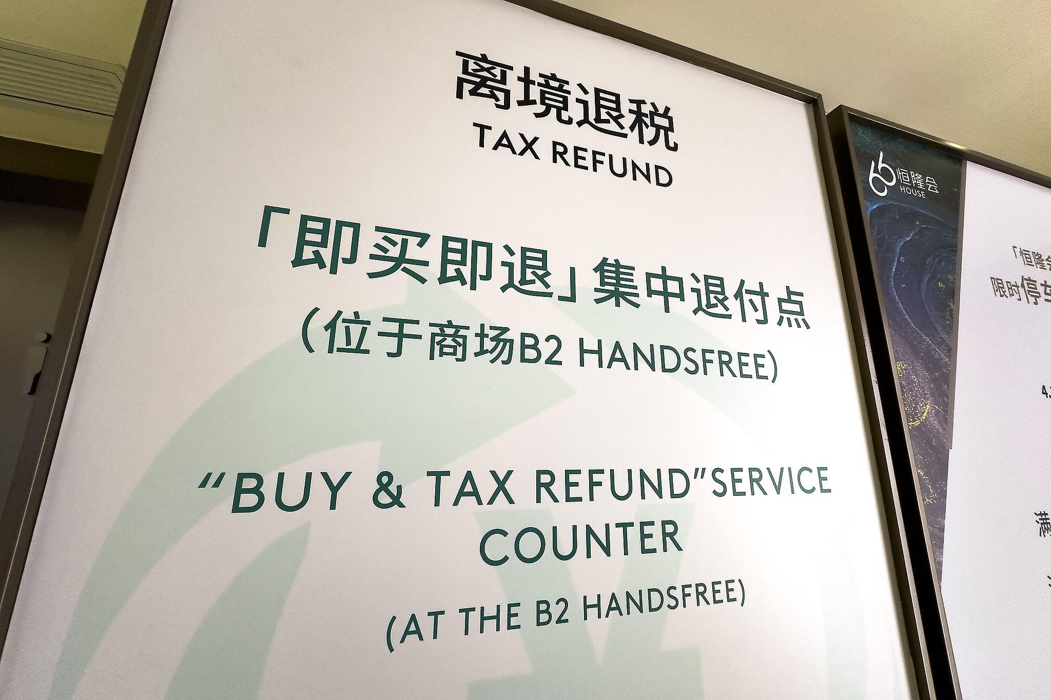 A notice for the "instant tax refund" service is seen on display at a shopping center in Shanghai. /VCG