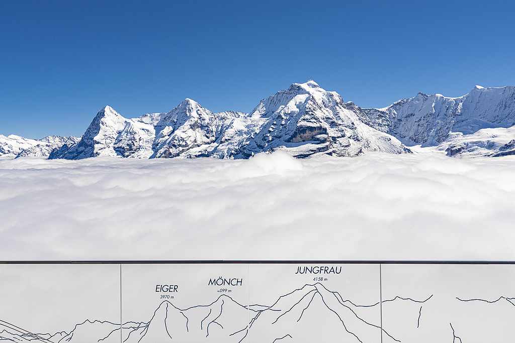 The snow-covered peaks of the Eiger and Mönch rise above the clouds in Switzerland. /VCG