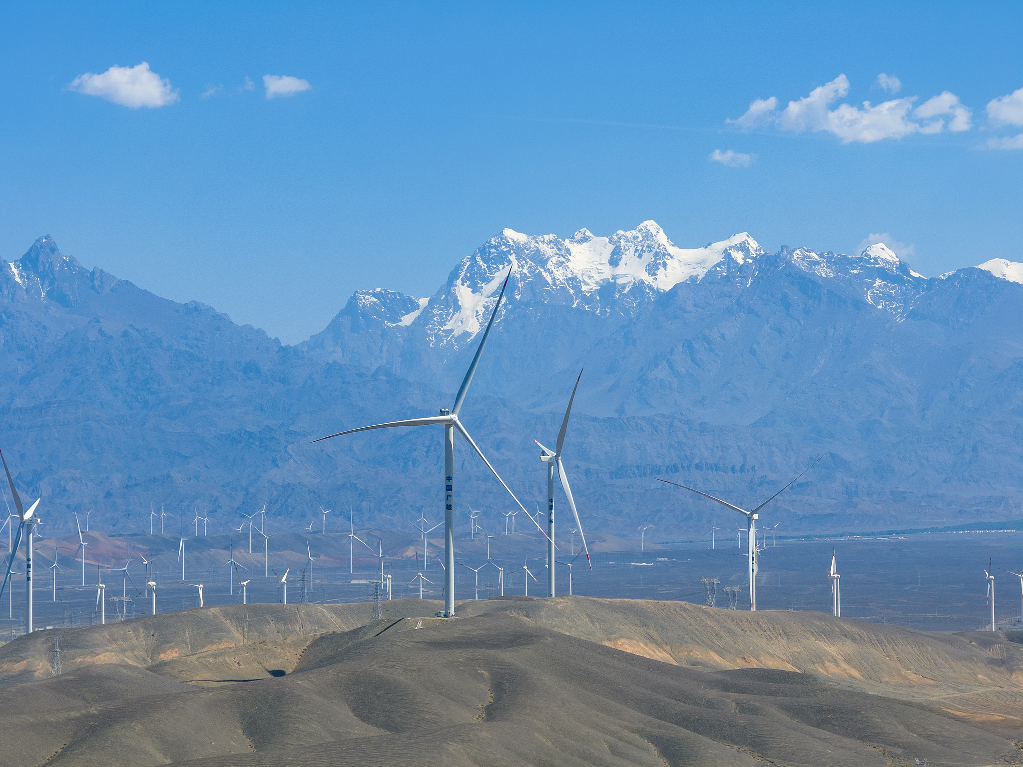 A wind farm beside the Tianshan Mountains, Urumqi, Xinjiang Uygur Autonomous Region, northwest China, June 24, 2024. /VCG