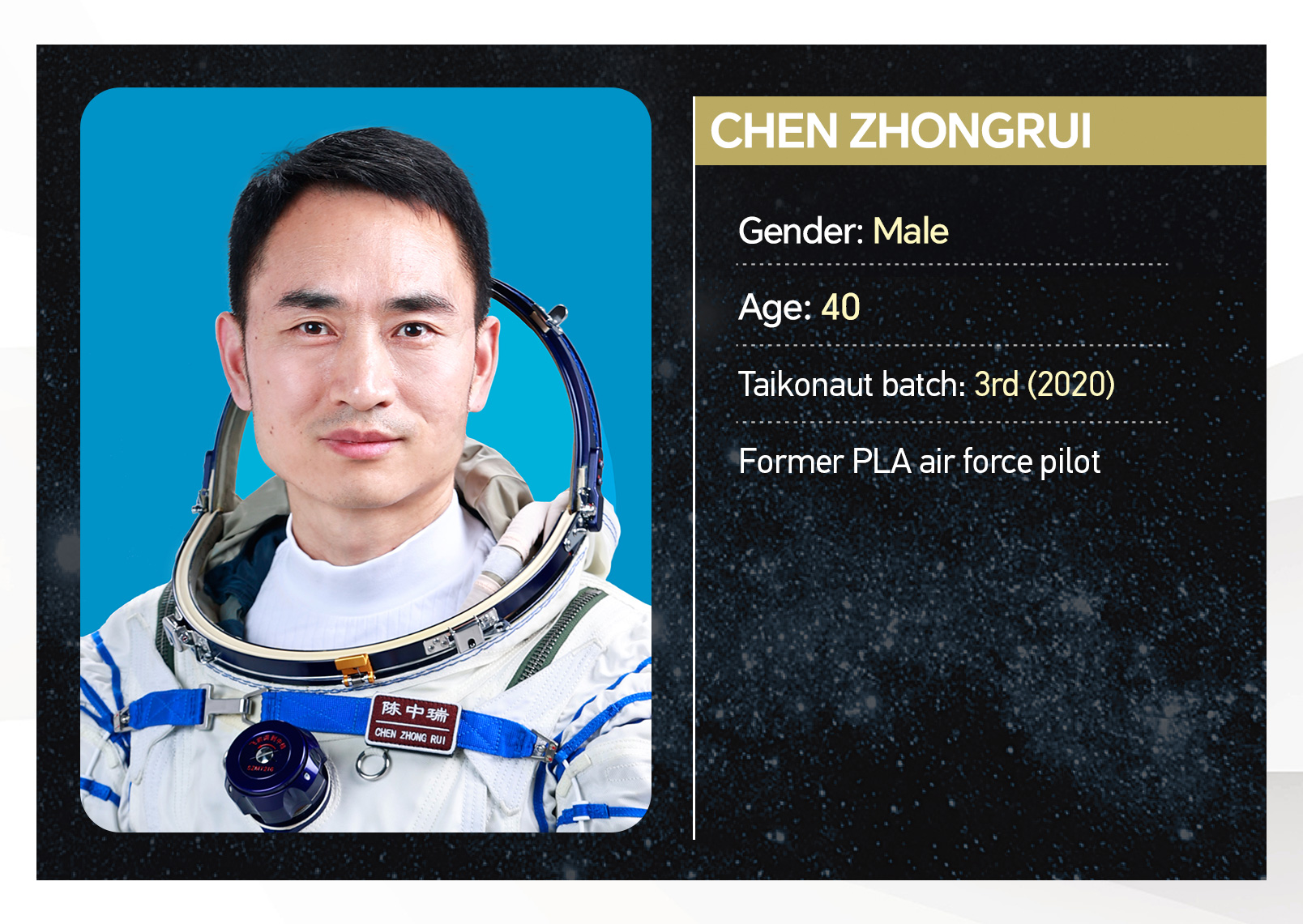 Chen Zhongrui is a newcomer to space. He is from the third intake of Chinese astronauts. Born in 1984, Chen is a former pilot of the Chinese People's Liberation Army Air Force.