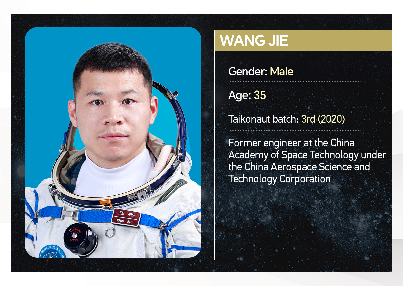 This is the first space mission for Wang Jie, who was selected to join the third intake of Chinese astronauts in 2020. Born in 1989, Wang is an engineer from the China Aerospace Science and Technology Corporation.