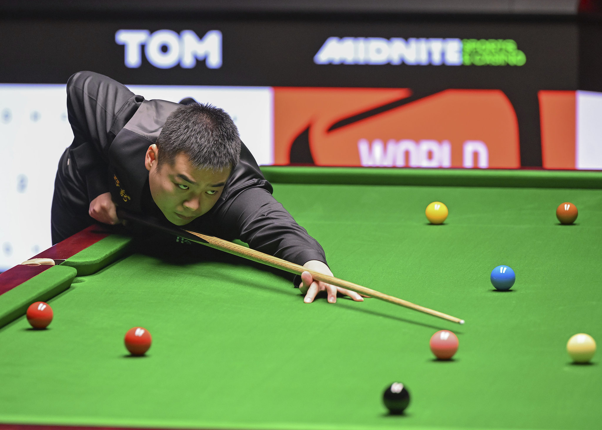 Pang Junxu of China hits a shot in the match against Zhang Anda of China at the World Snooker Championship in Sheffield, England, April 23, 2025. /VCG