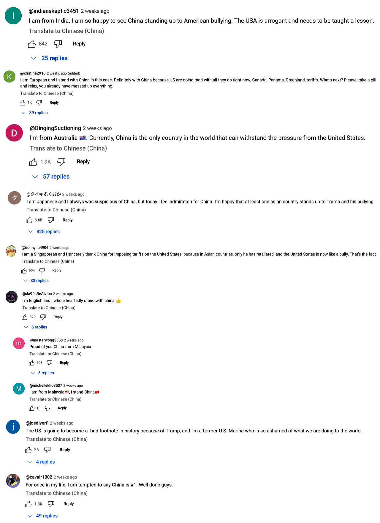Many viewers applauded China's commitment to justice, criticizing the United States for its "tariff robbery" and praising China's prompt and principled response. One viewer stated, "China is showing the entire world what having backbone looks like," while another said, "Thank you China! On this planet, most countries choose to kneel to the USA, and are competing to see who kneels more gracefully. Only China insists on justice and says no to the tariff robbery. China insists on justice, not only for itself, but also to tell people that there is still justice in this world."