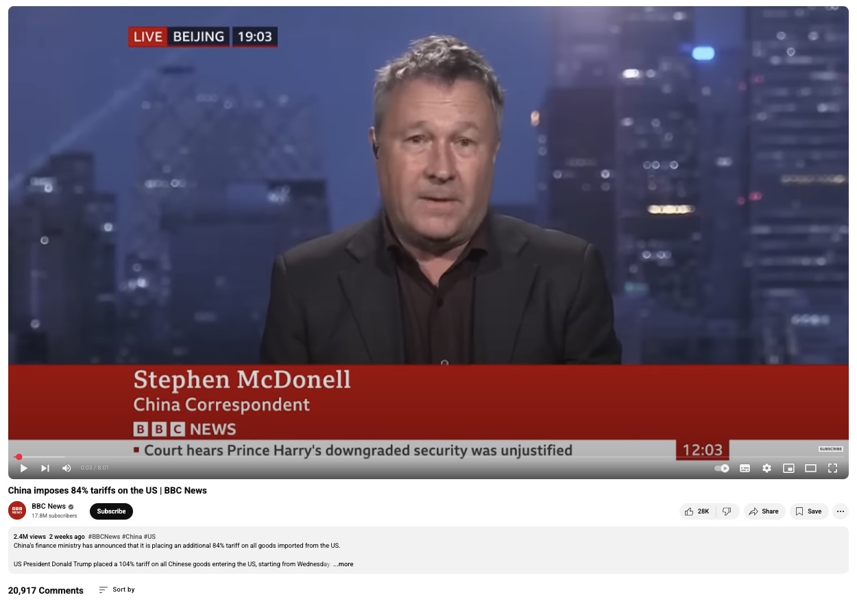 A BBC report on China's decision to raise tariffs on US imports to 84 percent, effective from 12:01 p.m. on April 10, in response to the US move to increase reciprocal tariffs, sparked widespread discussion on YouTube. /CGTN
