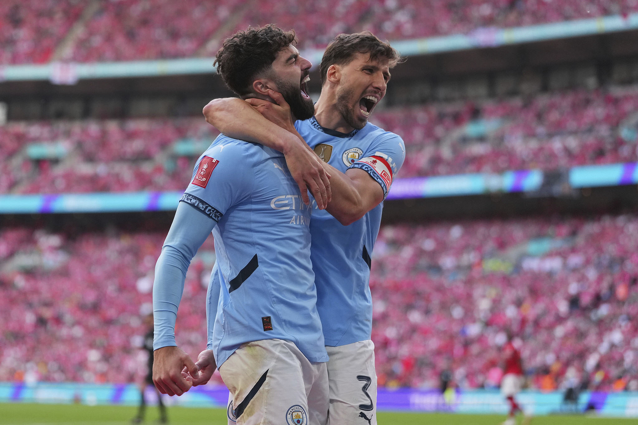 Players of Manchester City celebrate after scoring a goal in the FA Cup semifinals against Nottingham Forest at Wembley stadium in London, England, April 27, 2025. /VCG