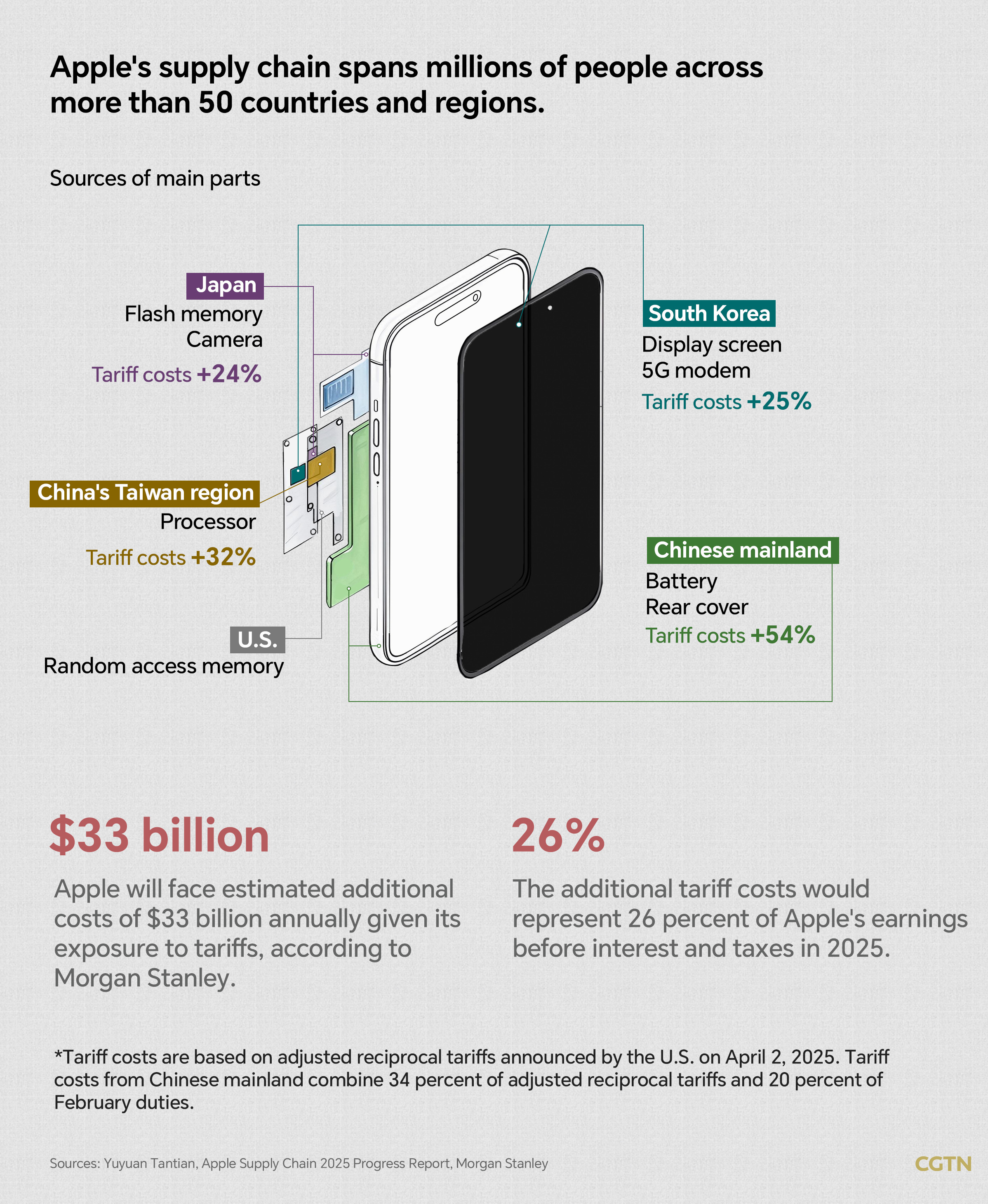 CGTN analyzed the impact of new tariffs on Apple's supply chain in the following graphic.