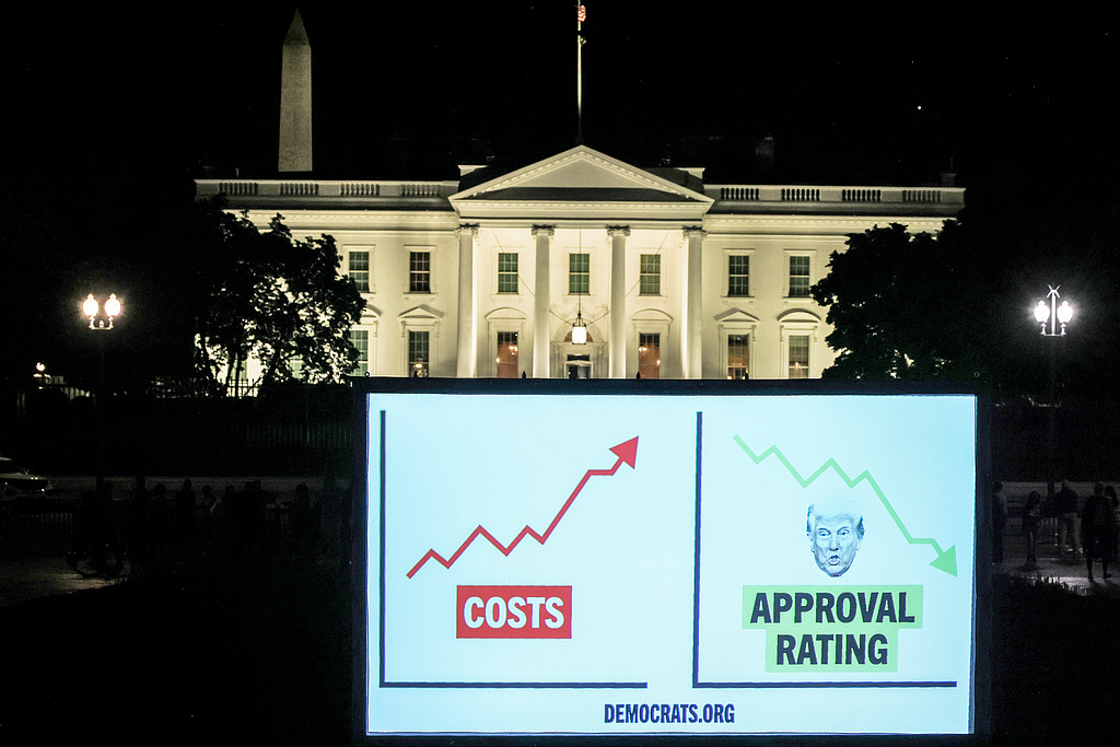 A projection displaying rising consumer costs and President Donald Trump's approval ratings is displayed in front of the White House, April 29, 2025 in Washington, D.C., U.S. /VCG