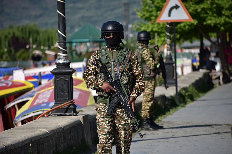 An Indian paramilitary soldier patrols the banks of Dal Lake in Srinagar in Indian-controlled Kashmir, April 28, 2025. /VCG