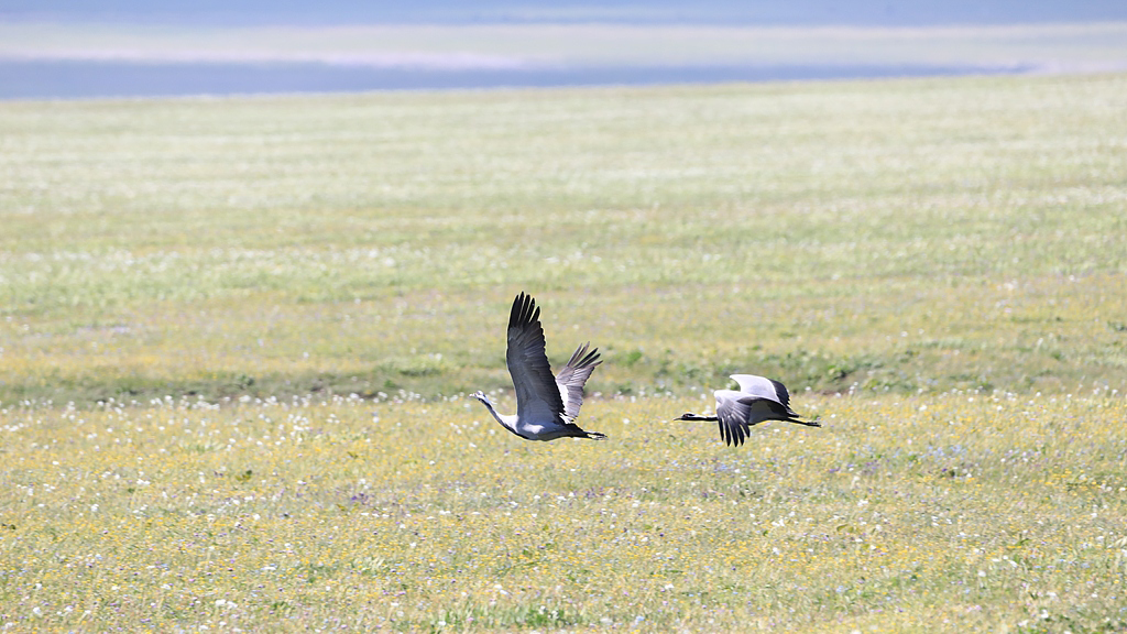 Rare cranes return as wetlands bloom in northwest China's highland. Common cranes flock to Altay, while elegant demoiselle cranes fill Hami's lakesides. April to May is peak migration period along this global flyway in the Xinjiang Uygur Autonomous Region.