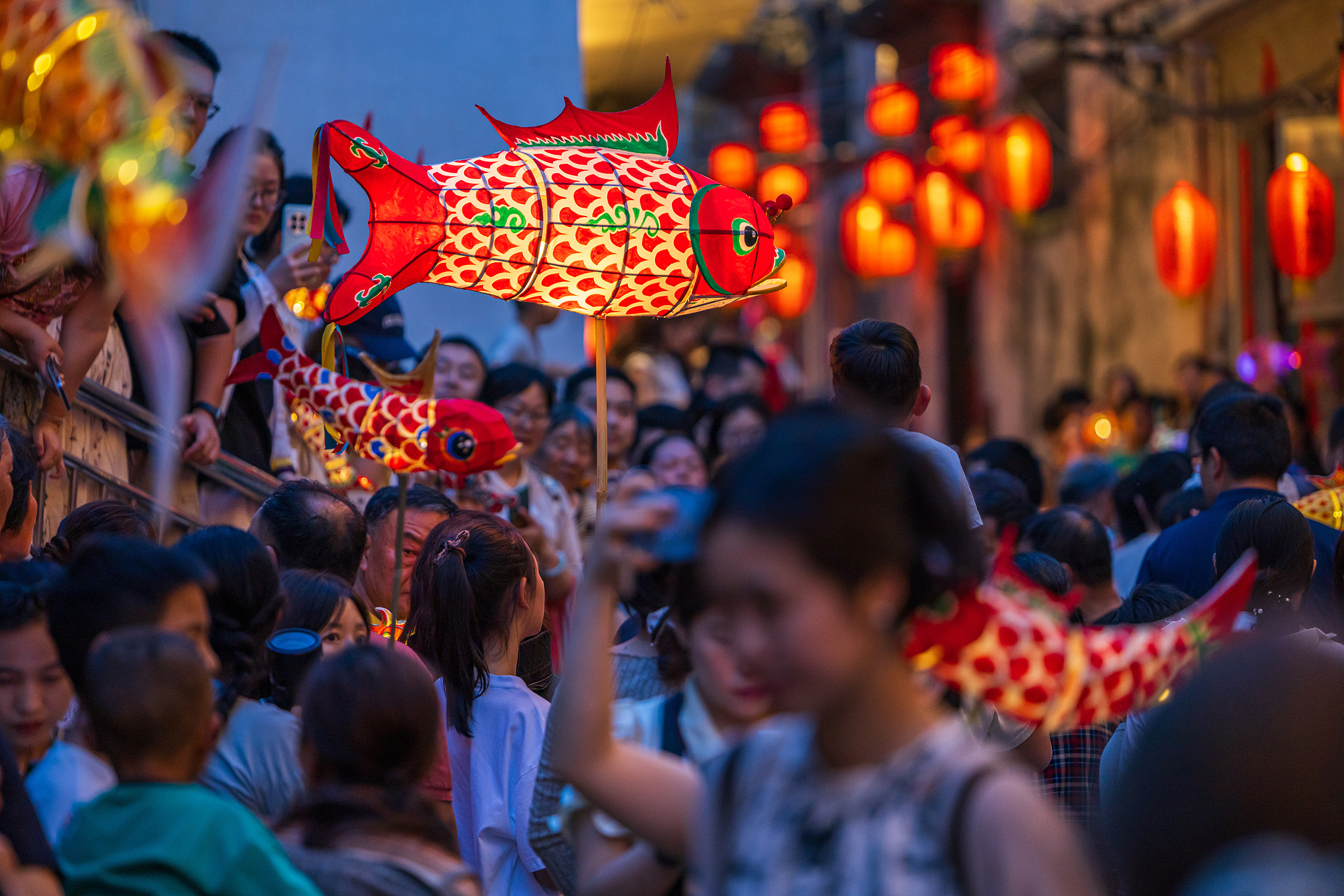 The intangible cultural heritage fish lantern performance attracts a large number of tourists during the May Day holiday in Huangshan, Anhui Province, May 2, 2025. /VCG