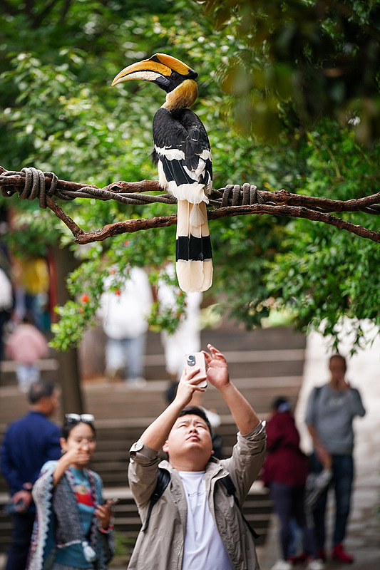 A visitor takes photos of a great hornbill at Yunnan Wildlife Park in Kunming City, Yunnan Province, May 1, 2025. /VCG