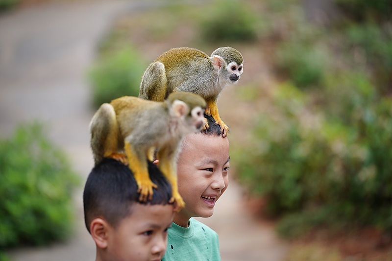 Children are seen interacting with the squirrel monkeys at Yunnan Wildlife Park in Kunming City, Yunnan Province, May 1, 2025. /VCG